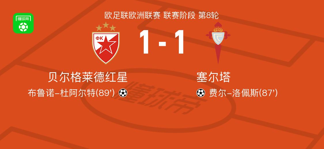 北京时间1月30日欧足联欧洲联赛 联赛阶段 第8轮,贝尔格莱德红星对阵塞尔塔。贝尔格莱德红星布鲁诺-杜阿尔特破门。塞尔塔费尔-洛佩斯破门。最终比分贝尔格莱德红星 1-1 塞尔塔。