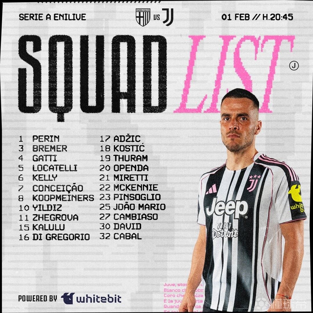 北京时间2月1日,尤文图斯官方公布了意甲第23轮他们做客挑战帕尔马的大名单,布雷默、伊尔迪兹领衔,库普梅纳斯、凯夫伦-图拉姆、乔纳森-戴维在列。